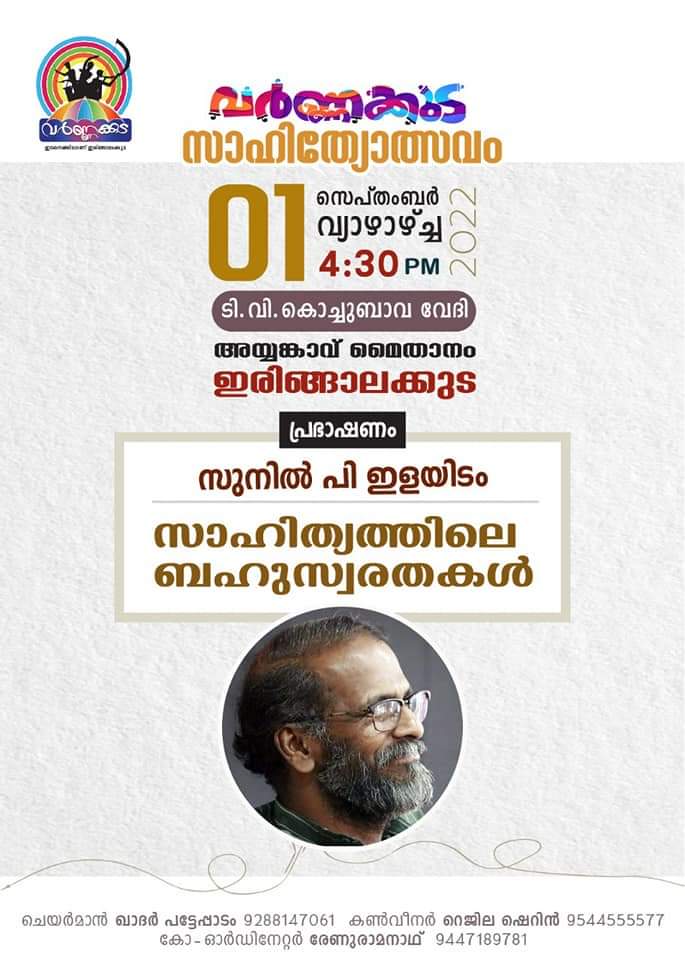 ഇന്ന് ഉച്ചതിരിഞ്ഞ് കേരളത്തിലെ പ്രശസ്തരായ കവികളുടെ കവിയരങ്ങും സുനിൽ.പി.ഇളയടത്തിന്റെ പ്രഭാഷണവും ഉണ്ടായിരിക്കും.
